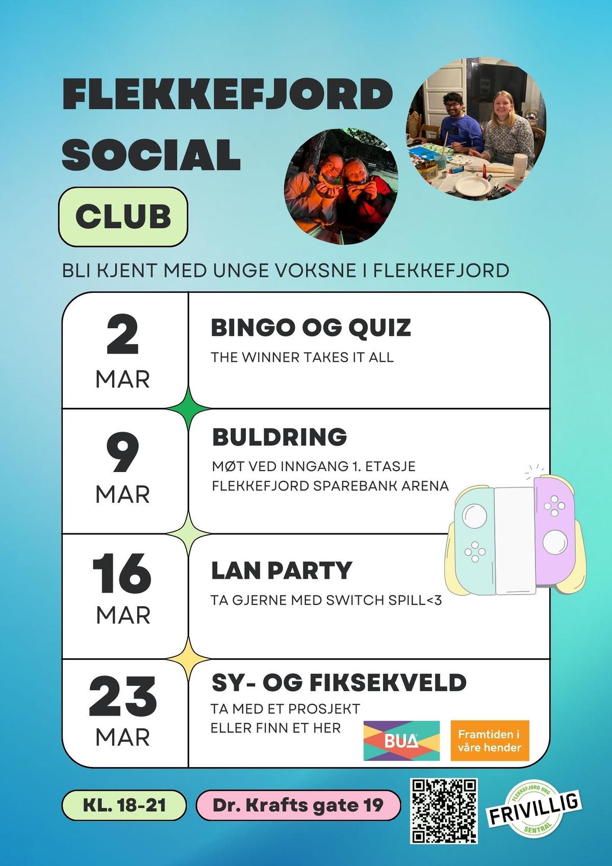 Vi er unge voksne som møtes hver mandag for å finne på aktive og kreative aktiviteter. Det er en sosial møteplass med lav terskel for å delta og bli kjent med nye folk. Kanskje du er ny i arbeidslivet og ny i Flekkefjord, eller har bodd her lenge og vil kjent med nye. Her handler det om å skape fellesskap og gode opplevelser sammen.